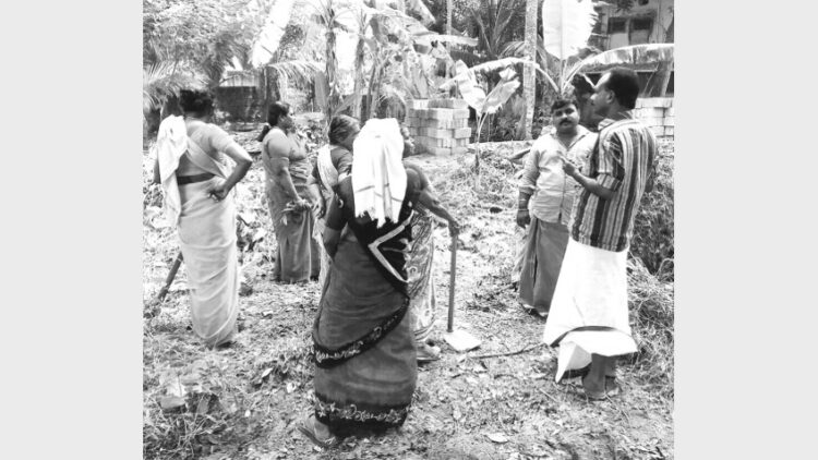 തൊഴിലുറപ്പ് ജോലിക്കിടെ തൊഴിലാളികള്‍ പാര്‍ട്ടി പരിപാടിക്ക് പോയെന്ന വിവരമറിഞ്ഞ് സ്ഥലത്തെത്തിയ അസി. ബിഡിഒ സുരേഷ് തൊഴിലാളികളോട് കാര്യങ്ങള്‍ ചോദിച്ചറിയുന്നു. ബിജെപി നേതാവ് തിരുനെല്ലിയൂര്‍ സുധീഷ് സമീപം