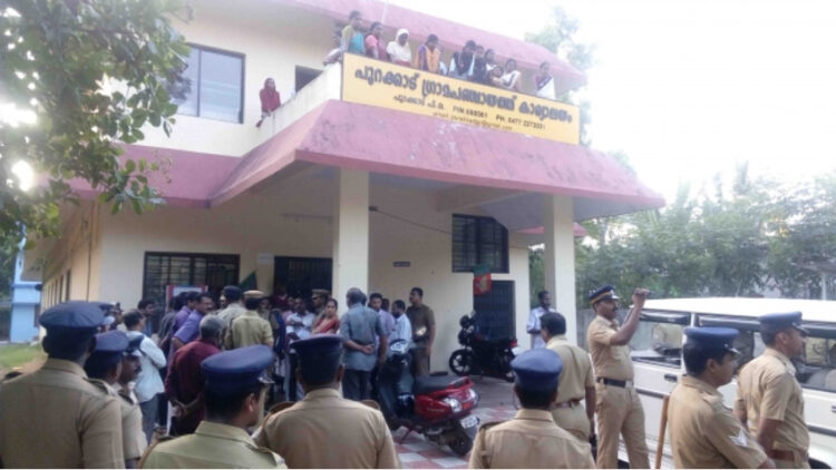 പഞ്ചായത്തിലെ ഒന്ന്, പതിനെട്ട്, പതിനേഴ് വാര്ഡുകളിലെ നൂറ്റി പതിനാലോളം കുടുംബങ്ങളാണ് നാലുവര്ഷത്തോളമായി വിവിധ ദുരിതാശ്വാസ ക്യാമ്പുകളിലും, ബന്ധുവീടുകളിലും, വാടക കെട്ടിടങ്ങളിലുമായി കഴിയുന്നത്. എന്നാല് ഇവരുടെ പുനരധിവാസം കഴിഞ്ഞ യുഡിഎഫ് സര്ക്കാരും ഇപ്പോഴത്തെ എല്ഡിഎഫും അട്ടിമറിക്കുകയായിരുന്നു. ക്യാമ്പുകളില് നരകയാതന അനുഭവിക്കുന്ന കുടുംബങ്ങള് ബിന്ദു ഷാജിയുടെ നേതൃത്വത്തില് സംഘടിക്കുകയായിരുന്നു. മണിക്കൂറുകളോളം മുറിക്കുള്ളില് കുടുങ്ങിയ ജീവനക്കാരെ പുറത്തിറക്കാന് അമ്പലപ്പുഴ, പുന്നപ്ര, ഏ ആര് ക്യാമ്പ് എന്നിവിടങ്ങളില് നിന്നുള്ള പോലീസ് സംഘം സ്ഥലത്തെത്തി. ഡിവൈഎസ്പി ഷാജഹാന്റെ നേതൃത്വത്തില് ചര്ച്ച നടത്തിയെങ്കിലും ബന്ധപ്പെട്ടവര് വന്ന് തീരുമാനമാകാതെ കെട്ടിടം തുറക്കില്ല എന്ന് പ്രതിഷേധക്കാര് അറിയിക്കുകയായിരുന്നു.