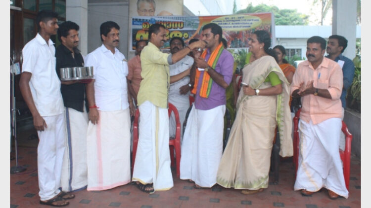 തിരുവനന്തപുരം നഗരസഭയിലെ ബിജെപി കൗണ്‍സിലര്‍മാര്‍ നടത്തിയ ഏകദിന ഉപവാസസമരം ബിജെപി സംസ്ഥാന സെക്രട്ടറി അഡ്വ വി.വി. രാജേഷ് പ്രതിപക്ഷ നേതാവ് ഗിരികുമാറിന് നാരങ്ങാനീര് നല്‍കി അവസാനിപ്പിക്കുന്നു