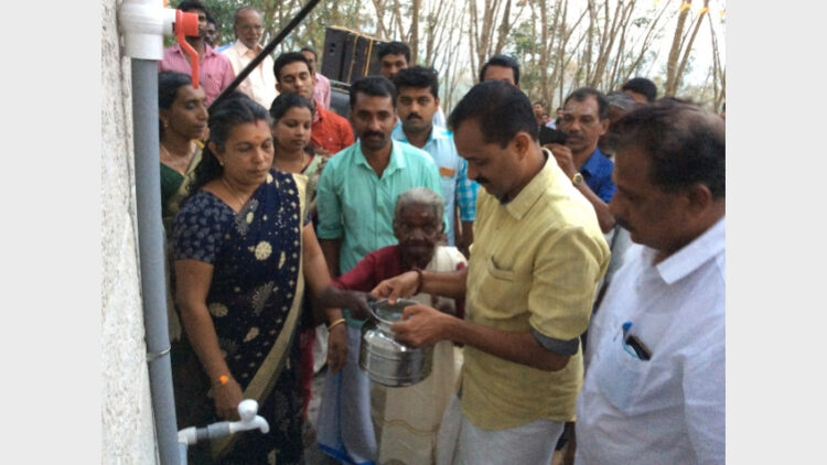 നെടുമങ്ങാട് നഗരസഭയിലെ പേരയത്തുകോണം വാര്‍ഡില്‍ കുട്ടന്‍കോളനിയില്‍ നടപ്പിലാക്കിയ കുടിവെള്ളപദ്ധതിയുടെ ഉദ്ഘാടനം ബിജെപി സംസ്ഥാന സെക്രട്ടറി വി.വി. രാജേഷ് നിര്‍വ്വഹിക്കുന്നു