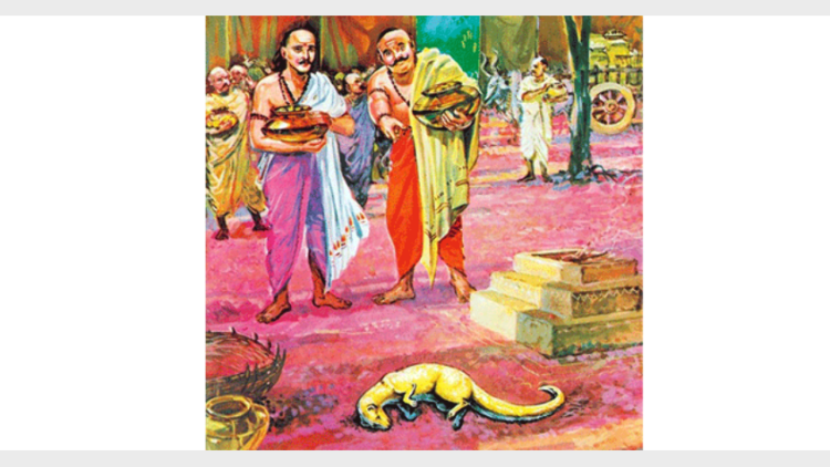 യുധിഷ്ഠിരന് അതിനെ കൗതുകത്തോടെ വിളിച്ചു; ശരീരത്തിന്റെ പകുതിഭാഗത്തിന് എങ്ങനെ സ്വര്ണം കിട്ടി എന്ന് അന്വേഷിച്ചു. അപ്പോള് കീരി തന്റെ കഥ പറയാന് തുടങ്ങി: