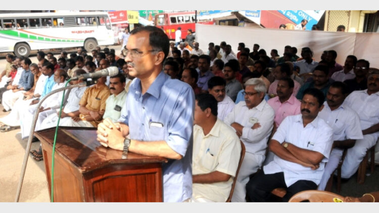 മാര്ക്സിസ്റ്റ് അക്രമവിരുദ്ധ ജനകീയ സമിതി കോട്ടയത്ത് നടത്തിയ ജനകീയ ധര്ണ്ണയില് ആര്എസ്എസ് പ്രാന്ത കാര്യകാരി സദസ്യന് അഡ്വ. എന്. ശങ്കര്റാം പ്രസംഗിക്കുന്നു