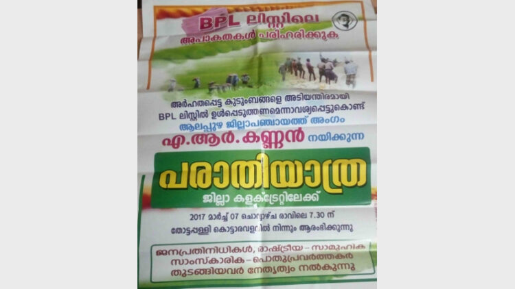 ജില്ലാപഞ്ചായത്തംഗമായ എ.ആര്. കണ്ണനാണ് ബിപിഎല് ലിസ്റ്റിലെ അപാകത പരിഹരിക്കണമെന്നാവശ്യപ്പെട്ട് ഇന്നുരാവിലെ 7.30ന് പരാതിയാത്ര എന്ന പേരില് കളക്ട്രേറ്റിലേക്ക് മാര്ച്ച നടത്തുമെന്ന് പ്രഖ്യാപിച്ചത്. ഇതിനായി ജില്ലാ കോ ഓഡിനേറ്റര്മാരായി ബ്ലോക്ക് പഞ്ചായത്തംഗങ്ങളായ ബിന്ദു ബൈജു, യു.എ. കബീര് എന്നിവരെയും തീരുമാനിച്ചു. എന്നാല് യാത്രയില് കോണ്ഗ്രസ് നേതാക്കളെ ഉള്പ്പെടുത്തുകയോ ക്ഷണിക്കുകയോ ചെയ്തില്ല. ഇതോടെ പരിപാടിക്കെതിരെ ഒരു വിഭാഗം നേതാക്കള് രംഗത്തുവന്നു.