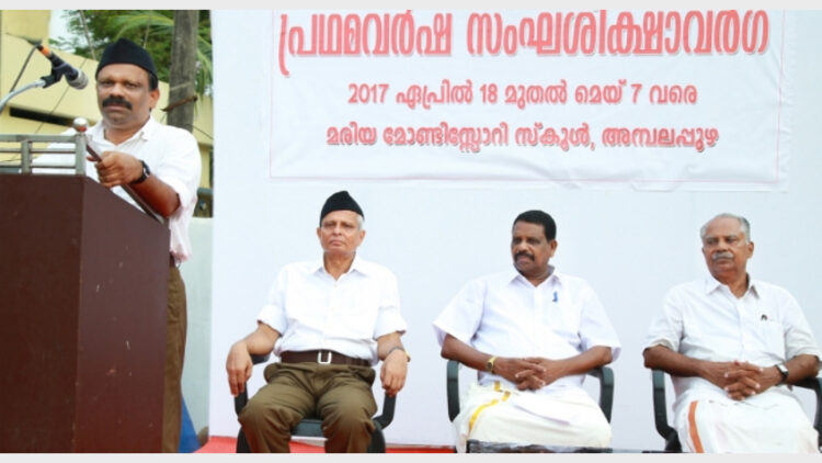 അമ്പലപ്പുഴയില്‍ നടന്ന പ്രഥമവര്‍ഷ സംഘശിക്ഷാ വര്‍ഗ്ഗിന്റെ സമാപന പരിപാടിയില്‍ ആര്‍എസ്എസ് പ്രാന്തീയ കാര്യകാരി സദസ്യന്‍ വത്സന്‍ തില്ലങ്കേരി മുഖ്യപ്രഭാഷണം നടത്തുന്നു. വര്‍ഗ്ഗ് കാര്യവാഹ് പി. ശശീന്ദ്രന്‍, ഒ. വാസുദേവന്‍, ഡോ. അമ്പലപ്പുഴ ഗോപകുമാര്‍ എന്നിവര്‍ സമീപം