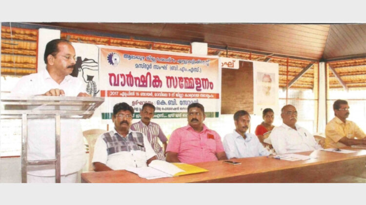 ജില്ലാ ഷോപ്‌സ് ആന്‍ഡ് എസ്റ്റാബ്ലിഷ്‌മെന്റ് മസ്ദൂര്‍ സംഘ് (ബിഎംഎസ്) ജില്ലാ വാര്‍ഷിക സമ്മേളനം കേരള പ്രദേശ് വാണിജ്യ മസ്ദൂര്‍ സംഘ് ജനറല്‍ സെക്രട്ടറി. കെ.ബി. സോമന്‍ ഉദ്ഘാടനം ചെയ്യുന്നു
