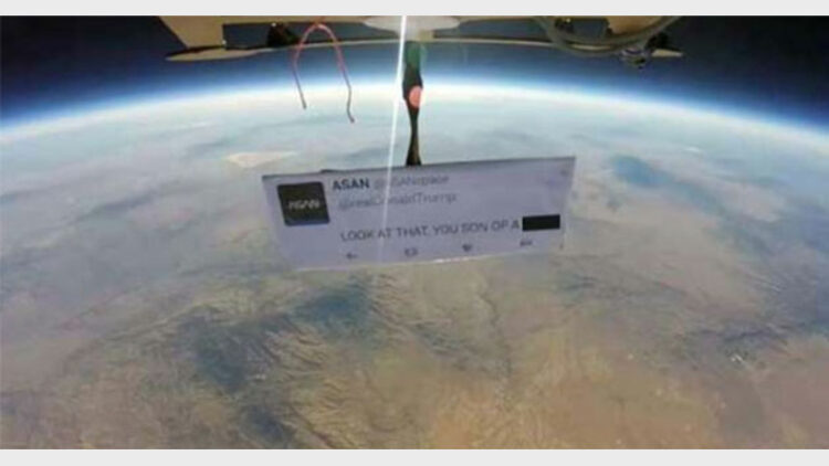 സ്വതന്ത്ര ബഹിരാകാശ ഏജന്സി വിക്ഷേപിച്ച കാലാവാസ്ഥ ബലൂണിലാണ് ട്രംപിനെ വിമര്ശിച്ചുള്ള വാക്കുകള് പ്രത്യക്ഷപ്പെട്ടത്. ലുക്ക് അറ്റ് ദാറ്റ് യൂ സണ് ഓഫ് എ ബിച്ച് എന്ന് എഴുതിയിരിക്കുന്ന പോസ്റ്റര് ബഹിരാകാശ ബലൂണില് ഘടിപ്പിച്ചിരിക്കുന്നു.