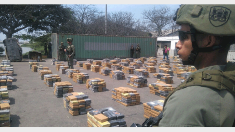 പിടിച്ചെടുത്ത കൊകെയ്ന് പ്യാക്കറ്റുകള്ക്ക് കാവല് നില്ക്കുന്ന സൈനികര്