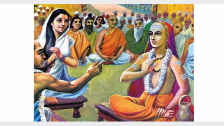 ശോണ നദീതീരത്തുള്ള വിഷ്ണുമിത്രന്റെ മകളായ ഭാരതിയെ മണ്ഡനമിശ്രന് വിവാഹം ചെയ്തു. അവര് കര്മ്മകാണ്ഡവേദഭാഗത്തിലെ മീമാംസാശാസ്ത്രത്തിലും ബ്രഹ്മ വിദ്യയിലും ശ്രവണ മാത്രയില് തന്നെ പാണ്ഡിത്യമാര്ജിച്ച സ്ത്രീരത്നമാകയാല് ഉഭയഭാരതി എന്നറിയപ്പെട്ടു. അപൂര്വമായി കാണപ്പെടുന്ന ഋഷികഃ എന്ന് വേദത്തില് വിശേഷിപ്പിക്കുന്ന സിദ്ധികളുള്ള യോഗിനിയാണ്. സാക്ഷാല് സരസ്വതീ സ്വരൂപമായിത്തന്നെ ദേശവാസികള് ഭാരതിയെ കണ്ടു. യോ ഗിനികളെയെല്ലാം ദേവീസ്വരൂപിണികളായി കാണുന്ന സമ്പ്രദായം ഭാരതത്തിന്റെ പ്രത്യേകതയാണല്ലോ.