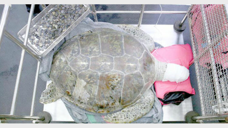 തുടര്ന്ന് സിടി സ്കാന് ചെയ്തു. അപ്പോഴാണ് വയറ്റില് ലോഹക്കഷണങ്ങള് നിറഞ്ഞതായി കണ്ടെത്തിയത്. അഞ്ച് സര്ജന്മാര് മണിക്കൂറുകള് നീണ്ട ഓപ്പറേഷന് നടത്തി വയറ്റിലെ ലോഹക്കഷണങ്ങള് പുറത്തെടുത്തു. എല്ലാം പല തരത്തിലുള്ള നാണയങ്ങള്. 915 നാണയങ്ങളാണ് ആമയുടെ വയറ്റില് നിന്ന് ലഭിച്ചത്.