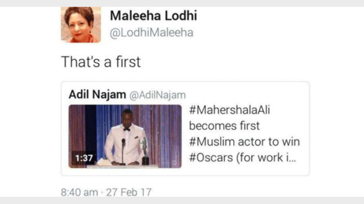 മികച്ച സപ്പോര്ട്ടിങ് ആക്റ്ററിനുള്ള ഓസ്കര് മഹര്ഷാല അലിക്കു കിട്ടിയതു മുതലാണ് ഈ പ്രശ്നം തുടങ്ങിയത്. ഓസ്കര് കിട്ടുന്ന ആദ്യ മുസ്ലിം എന്ന വിശേഷണത്തോടെയാണ് അലിയുടെ പുരസ്കാര ലബ്ധിയെ ചിലര് ആഘോഷിച്ചത്. ട്വിറ്റര് അടക്കമുള്ള സോഷ്യല് മീഡിയ പ്ലാറ്റ്ഫോമില് അലിക്ക് ഓസ്കര് കിട്ടിയതിനു വലിയ പ്രാധാന്യം കിട്ടി. പ്രത്യേകിച്ച് മുസ്ലിം സമൂഹത്തില് നിന്ന് ട്വീറ്റുകളും റീ ട്വീറ്റുകളും. എന്നാല് ഇക്കാര്യത്തില് പുലിവാലു പിടിച്ചത് ഐക്യരാഷ്ട്ര സഭയിലേക്കുള്ള പാക്കിസ്ഥാന്റെ പ്രതിനിധിയായ മലീഹ ലോധിയാണ്. അലിയെ പ്രശംസിച്ചു കൊണ്ടുള്ള ട്വീറ്റ് മഹീല വൈകാതെ പിന്വലിച്ചു. എന്നാല് അപ്പോഴേക്ക് അതിന്റെ സ്ക്രീന് ഷോട്ടുകള് പ്രചരിച്ചു, പാക്കിസ്ഥാനില് നിന്ന് വലിയ എതിര്പ്പാണിപ്പോള് മഹീല നേരിടുന്നത്.