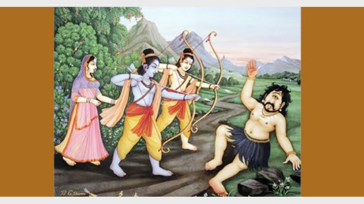 ഭയം ജനിപ്പിക്കുന്ന രീതിയിലുള്ളശബ്ദങ്ങളും വന്യമൃഗങ്ങളുടെ അലര്‍ച്ചകളും കൊണ്ട് മുഖരിതമായിരുന്നു ആ കാട്. ദുര്‍ഘടം നിറഞ്ഞ കാട്ടിനുള്ളിലൂടെ നടന്ന് പോകവേ, കണ്ടാല്‍ ഭയവും അറപ്പും തോന്നുന്ന ഒരു രാക്ഷസന്‍ രാമ ലക്ഷ്മാണാദികളുടെ മുന്നില്‍ ചാടിവീണ് അവരുടെ നേര്‍ക്ക് പാഞ്ഞടുത്തു. ഒരു പുലിത്തോലായിരുന്നു അവനുടുത്തിരിക്കുന്നത്.
