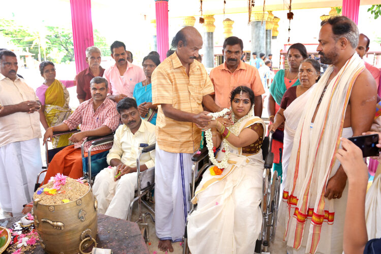 കളവംകോടം ശക്തീശ്വരം ക്ഷേത്രഗുരുമണ്ഡപത്തില്‍ വീല്‍ചെയറിലിരുന്ന് രതീഷും രേഖയും