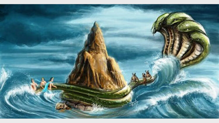 തുടര്‍ന്ന് മന്ദരപര്‍വ്വതം സമുദ്രത്തില്‍ താണുപോവുകയുണ്ടായി. ദേവന്മാരുടെ പ്രാര്‍ത്ഥനയെത്തുടര്‍ന്ന് വിഷ്ണു ഒരുവലിയ ആമയുടെ രൂപം ധരിക്കയും പര്‍വതത്തെ താങ്ങിനിര്‍ത്തുകയും ദേവന്മാരോടൊപ്പം സമുദ്രമഥനത്തില്‍ പങ്കുചേരുകയും ചെയ്തു. വീണ്ടുമൊരായിരം വര്‍ഷം കഴിഞ്ഞപ്പോള്‍ കൈയില്‍ കമണ്ഡലുവും ദണ്ഡുമായി ധന്വന്തരി സമുദ്രത്തില്‍ നിന്നും പ്രത്യക്ഷപ്പട്ടു. പിന്നീട് അപ്‌സരസ്സുകളും മദ്യദേവതയായ വാരുണിയും പുറത്തുവന്നു.