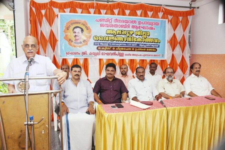 ആലപ്പുഴ: ജനസംഘത്തിന്റെ സ്ഥാപക നേതാവ് പണ്ഡിറ്റ് ദീനദയാല്‍ ഉപാദ്ധ്യായ ദേശീയതയെ ഉത്‌ബോധിപ്പിച്ച ദേശസ്‌നേഹിയായിരുന്നുവെന്ന് ദേശീയ അദ്ധ്യാപക പുരസ്‌കാര ജേതാവും ആലപ്പുഴയുടെ ഗുരുനാഥനുമായ കല്ലേലി രാഘവന്‍പിളള അഭിപ്രായപ്പെട്ടു. പണ്ഡിറ്റ് ദീനദയാല്‍ ഉപാദ്ധ്യായ ജന്മശതാബ്ദി ആഘോഷവുമായി ബന്ധപ്പെട്ടു നടത്തിയ ജില്ലാ വൈജ്ഞാനികസദസ്ഉത്ഘാടനം ചെയ്യുകയായിരുന്നു അദ്ദേഹം.