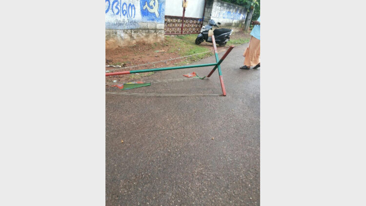 കമ്പി വളച്ച് റോഡില് ഗതാഗതതടസം ഉണ്ടാക്കുന്ന രീതിയില് ഇന്നലെ പുലര്ച്ചെയാണ് കാണപ്പെട്ടത്. കഴിഞ്ഞ മൂന്ന് ദിവസങ്ങള്ക്ക് മുന്പ് കല്ലുകുഴി ജങ്ഷനില് ഓട്ടോ തൊഴിലാളി യൂണിയന്റെ (ബിഎംഎസ്) കൊടിമരവും ഇതുപോലെ തകര്ക്കുകയുണ്ടായി.