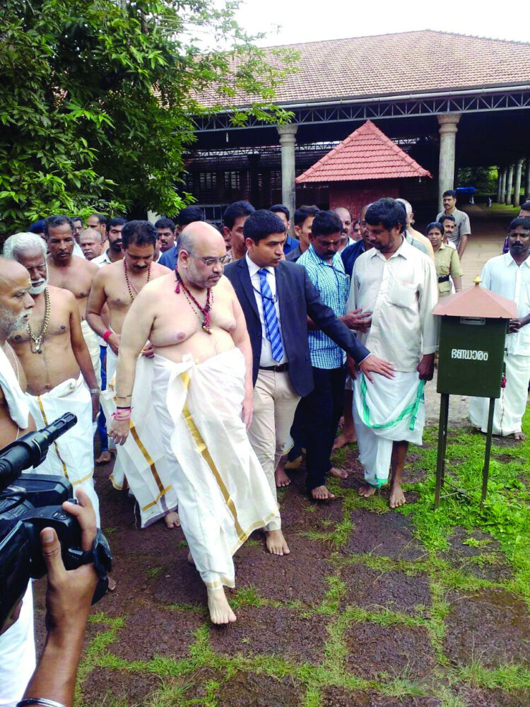 പയ്യന്നൂര്‍: ജിഹാദി-ചുവപ്പ് ഭീകരതക്കെതിരെ ബിജെപി സംസ്ഥാന അധ്യക്ഷന്‍ കുമ്മനം രാജശേഖരന്‍ നയിക്കുന്ന ജനരക്ഷായാത്ര ഉദ്ഘാടനം ചെയ്യാന്‍ പയ്യന്നൂരിലെത്തിയ ബിജെപി ദേശീയ അധ്യക്ഷന്‍ അമിത്ഷാ തന്റെ പരിപാടിക്ക് തുടക്കം കുറിച്ചത് തളിപ്പറമ്പ് ശ്രീരാജരാജേശ്വരനെ വണങ്ങി. ക്ഷേത്രത്തിലെത്തിയ അദ്ദേഹം ദേവന് പൊന്നുംകുടം വെച്ച് തൊഴുതു. രാവിലെ പത്ത് മണിയോടെ ക്ഷേത്രത്തിലെത്തിയ അമിത്ഷായെ ക്ഷേത്രം തന്ത്രി ഇ.പി.കുബേരന്‍ നമ്പൂതിരി, ട്രസ്റ്റി എന്‍.കെ.ഇ.ചന്ദ്രശേഖരന്‍, പ്രശസ്ത ജ്യോതിഷന്‍ മാധവപ്പൊതുവാള്‍ തുടങ്ങിയവര്‍ ചേര്‍ന്ന് സ്വീകരിച്ചു. ബിജെപി സംസ്ഥാന അധ്യക്ഷന്‍ കുമ്മനം രാജശേഖരന്‍, സംസ്ഥാന സെക്രട്ടറി കെ.സുരേന്ദ്രന്‍, നളിന്‍ കുമാര്‍ കട്ടീല്‍, ബി.എല്‍.സന്തോഷ് തുടങ്ങിയവരും അദ്ദേഹത്തോടൊപ്പമുണ്ടായിരുന്നു.