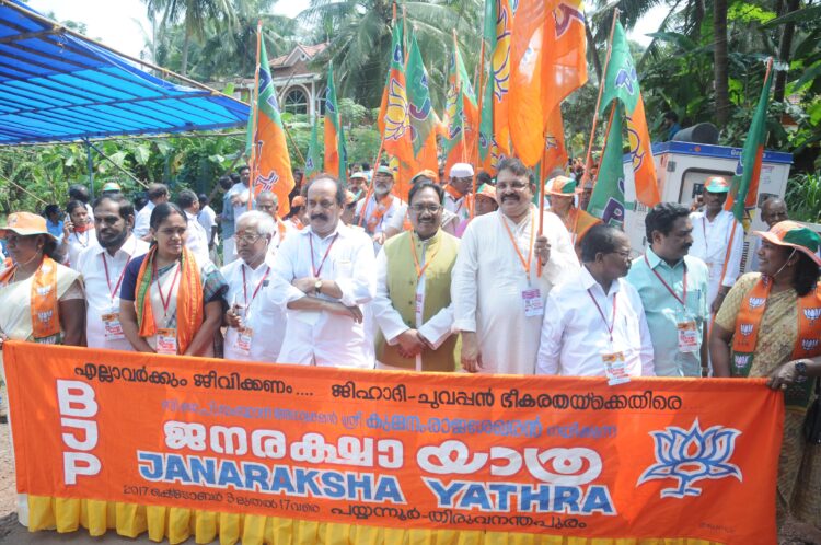 കണ്ണുര്‍: ചെങ്കോട്ടകളില്‍ പരിവര്‍ത്തനത്തിന്റെ ശംഖൊലിയുമായി ജനരക്ഷാ യാത്ര.ചെങ്കോട്ടകളെ കാവിയണിയിച്ച് യുപി മുഖ്യമന്ത്രി യോഗി ആദിത്യ നാഥിന്റെ പ്രയാണം. ബിജെപി സംസ്ഥാന അധ്യക്ഷന്‍ കുമ്മനം രാജശേഖരന്‍ നയിക്കുന്ന ജിഹാദി-ചുവപ്പ് ഭീകരതയ്‌ക്കെക്കെതിരെയുള്ള ജന രക്ഷായാത്രയില്‍ കീച്ചേരിയില്‍ നിന്നാണ് യോഗി ആദിത്യനാഥ് ഇന്നലെ രാവിലെ അണിചേര്‍ന്നത്.