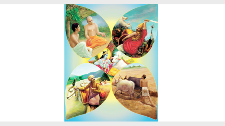 ഇവിടെ ശൂദ്രന് സര്വശില്പാദി നിര്മാണ പ്രവര്ത്തനങ്ങളാണ് ഉപദേശിക്കുന്നത്. ബ്രാഹ്മണന് പഠിക്കലും പഠിപ്പിക്കലും ഭൂമിയുടെ (രാഷ്ട്രത്തിന്റ) സംരക്ഷയാണ് ക്ഷത്രിയ ധര്മ്മം, കൃഷിയും ഗോരക്ഷയും വൈശ്യന്റെ ആചാരഭാഗമായ ധര്മ്മമാണ്.