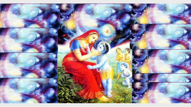 യശോദയായി ജന്മമേറ്റ ധരിത്രീ ദേവി തന്റെ ഈടുവയ്പിലെ വാത്സല്യമത്രയും ആ വളര്ത്തുമകനില് കോരിച്ചൊരിഞ്ഞൂ. വിശ്വപ്രകൃതി കൂമ്പാരം കൂട്ടിയ മാതൃവാത്സല്യത്തിന്റെ തല്സ്വരൂപമായി ദേവി ഉരുത്തിരിഞ്ഞു. ഒരിക്കല്, ബലരാമനും മറ്റു ഗോപകുമാരന്മാരും കളിച്ചുകൊണ്ടിരിക്കേ, കൃഷ്ണന് മണ്ണുതിന്നുവെന്ന് അവര് ചെന്നു യശോദയെ അറിയിച്ചു.