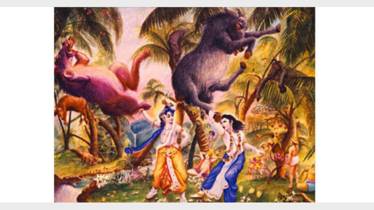 ഉച്ചയോടെ അവരെല്ലാവരും ഗോക്കളേയും കൊണ്ട് താലവനത്തിലെത്തി. സുദാമാവ് പറഞ്ഞതു ശരിയാണെന്നു ഏവര്‍ക്കും ബോധ്യമായി-താലവനം പനമ്പഴത്തിന്റെ ഗന്ധത്തില്‍ മുങ്ങിക്കുളിച്ചുനില്‍പ്പാണ്. അടുക്കച്ചുമട് പഴങ്കുലകള്‍ ഏറ്റിനില്‍ക്കുന്ന പനകള്‍. ബലരാമന്‍ ഒരു പനയുടെ ചുവട്ടില്‍ ചെന്നുനിന്നു. ഉയരത്തിലേക്ക് തലയെത്തിച്ചുനില്‍ക്കുന്ന അതിന്റെ, വട്ടംപിടിച്ചാല്‍ കയ്യെത്താത്ത തായ്‌ത്തടിയില്‍പ്പിടിച്ച് രൗഹിണേയന്‍ ബലമായി കുലുക്കി. പന ഒന്നുലഞ്ഞു. ആ ഉലച്ചലില്‍ പന ഒട്ടാകെ കുലുങ്ങി. പഴങ്കുലകള്‍ ആടിയുലഞ്ഞു. താഴെ വീണുകിടന്ന ഉണങ്ങിയ ഇലകളില്‍ കലമ്പലുണ്ടാക്കി പഴങ്ങള്‍ തുരുതുരാ ഉതിര്‍ന്നു.