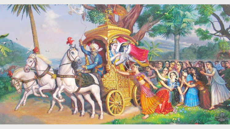 കൃഷ്ണനും ബലരാമനും യാത്ര ചെയ്യാനുള്ള രഥം തയ്യാറായി നില്‍പ്പുണ്ട്. അരികെ നന്ദനും അക്രൂരനും നില്‍പ്പുണ്ടായിരുന്നു. കൃഷ്ണനും ബലരാമനും അവരെ സാഷ്ടാംഗം നമസ്‌കരിച്ചു. അവര്‍ അവരെ രണ്ടുപേരെയും ആശീര്‍വദിച്ചു. ആ രംഗം കണ്ട് വൃന്ദാവനം മുഴുവന്‍ കണ്ണു തുടച്ചു.