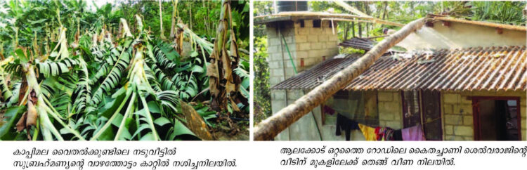 ആലക്കോട്: മലയോര മേഖലയില് കഴിഞ്ഞ ദിവസമുണ്ടായ കാറ്റില് വന് കൃഷിനാശം. ആലക്കോട് തെങ്ങ് വീണ് വീട് തകര്ന്നു. കാപ്പിലമ വൈതല്ക്കുണ്ടിലെ സുബ്രഹ്മണ്യന്റെ വാഴത്തോട്ടമാണ് തിങ്കളാഴ്ചയുണ്ടായ കനത്ത കാറ്റില് നശിച്ചത്. നൂറോളം കുലച്ച വാഴകള് ഉള്പ്പെടെ അഞ്ഞൂറോളം വാഴകള് നശിച്ചിട്ടുണ്ട്. കാപ്പിമല മേഖലയിലും വന്കൃഷിനാശം ഉണ്ടായിട്ടുണ്ട്. കാറ്റില് തെങ്ങുവീണ് ആലക്കോട് ഒറ്റത്തൈ റോഡിലെ കൈതച്ചാണി ശെല്വരാജിന്റെ വീട് തകര്ന്നു. ഇന്നലെ രാവിലെയായിരുന്നു സംഭവം. ഈസമയം വീടിനുള്ളില് കുടുംബാംഗങ്ങള് ഉണ്ടായിരുന്നെങ്കിലും അത്ഭുതകരമായി രക്ഷപ്പെടുകയായിരുന്നു. റോഡിലുണ്ടായിരുന്ന മരം കടപുഴകി വൈദ്യുതി ലൈനില് വീണതിനാല് ഏറെ നേരം വൈദ്യുത ബന്ധം താറുമാറായി.