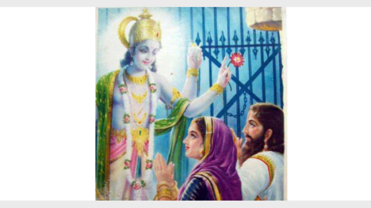 അക്രൂരനും വസുദേവരും മഞ്ചത്തിന്റെ സമീപത്തായി സ്ഥിതിചെയ്തു. പുത്രന്റെ ക്ഷേമത്തെ ആഗ്രഹിച്ചുകൊണ്ടിരുന്ന ദേവകി, പട്ടണപ്പെണ്ണുങ്ങളുടെ മധ്യത്തില് ഇരുന്നിരുന്നു-അവസാനകാലത്തിലെങ്കിലും മകന്റെ മനോഹരമായ മുഖം കാണാമല്ലോ എന്നോര്ത്തുകൊണ്ട്. പുത്രഗൃദ്ധിനിയെന്നതിനു പുത്രക്ഷേമാ ഭികാംക്ഷിണി എന്നാണ് വ്യാഖ്യാനം-‘വിഷ്ണുപുരാണത്തിലപ്പോള് അച്ഛനേയും അമ്മയേയും കാണാന് കാരാഗൃഹത്തിലേക്ക് പോവുന്നില്ല, അല്ലേ?”പക്ഷേ, നമുക്ക് പോവാതിരിക്കാനാവില്ല.