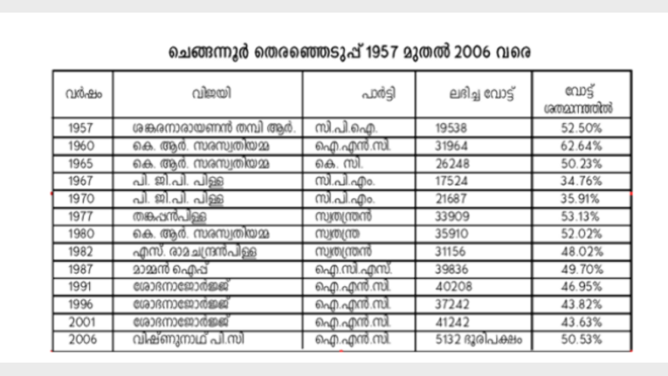 1957 മുതല് മാറിയും മറിഞ്ഞും ചിലപ്പോള് സ്വതന്ത്രരെ പുല്കിയും മനസ്സ് തുറക്കാതെ ചെങ്ങന്നൂര് നിലകൊള്ളുമ്പോള് കാലഘട്ടത്തിന്റെ മാറ്റം ആഗ്രഹിക്കുന്ന പുതുതലമുറ ആരെ പുല്കും എന്നത് ശ്രദ്ധേയമാണ്. ഇന്ത്യ ഒട്ടാകെ മാറ്റത്തിന്റെ കാഹളം മുഴക്കി ഭാരതത്തെ ലോകനെറുകയിലെത്തിക്കാന് കുതിക്കുന്ന രാഷ്ട്രീയ ചിന്താധാരയില്നിന്ന് മാറി അവര് ചിന്തിക്കുമെന്ന് തോന്നുന്നില്ല.