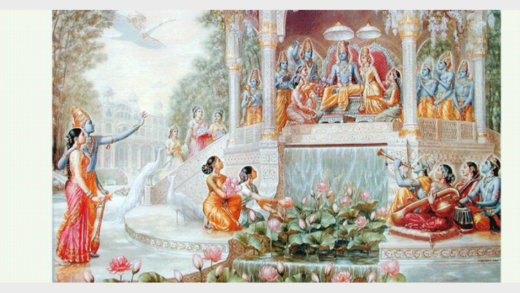 ലലനാമണികളോടൊപ്പമെത്തുന്ന വൈമാനികന്‍ അവിടെ കാമക്രോധാദി ദോഷങ്ങളെ നിര്‍വീര്യമാക്കി, മധുവൂറുന്ന പുഷ്പങ്ങള്‍ സുഗന്ധം പരത്തി നില്‍ക്കുന്നുണ്ടെങ്കിലും ആ വായുഗന്ധം ഇവരെ ബാധിക്കുന്നില്ല. സര്‍വപാപങ്ങളെയും നശിപ്പിക്കുന്ന ഭഗവാന്റെ മഹിമയെ വാഴ്‌ത്തുന്ന ഗീതങ്ങള്‍ ഇവര്‍ ആലപിച്ചുകൊണ്ടേയിരിക്കുന്നു.  അതില്‍ പ്രസന്നത ചൊരിഞ്ഞു നില്‍ക്കുന്ന ഭഗവാന്‍.