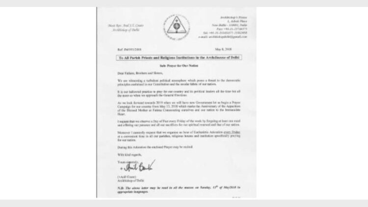 ദല്‍ഹിയിലെ ലത്തീന്‍ കത്തോലിക്കാ മെത്രാന്‍ അനില്‍ കൂട്ടോ പുറപ്പെടുവിച്ച ഒരു കല്‍പ്പനയില്‍ ഭാരതത്തില്‍ നടക്കാന്‍ പോകുന്ന പൊതുതെരഞ്ഞെടുപ്പിനെ മുന്നില്‍ കണ്ടുകൊണ്ട് രാജ്യനന്മയ്‌ക്കായി അദ്ദേഹത്തിന്റെ രൂപതാംഗങ്ങള്‍ പ്രാര്‍ഥിക്കുകയും ഉപവസിക്കുകയും ചെയ്യുവാന്‍ ആഹ്വാനം ചെയ്തിരിക്കുന്നു. പ്രഥമദൃഷ്ട്യാ ഇത് നാം ശ്രദ്ധിക്കേണ്ട സംഗതിയല്ല. ക്രിസ്ത്യാനികളല്ലാത്തവര്‍ക്ക് അത് പെട്ടെന്ന് മനസ്സിലാവുകയില്ലെന്ന് മാത്രം.