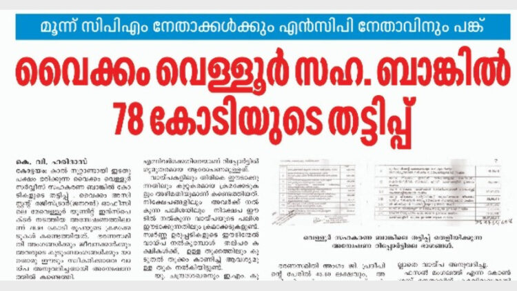 ബാങ്കില് 78 കോടി രൂപയുടെ തട്ടിപ്പു നടന്നെന്ന്, കഴിഞ്ഞ മെയ് 26നാണ് ജന്മഭൂമി റിപ്പോര്ട്ടു ചെയ്തത്. ജന്മഭൂമി വാര്ത്തയുടെ അടിസ്ഥാനത്തില് നിയമസഭയില് വി.പി. സജീന്ദ്രന് എംഎല്എ ചോദ്യം ഉന്നയിച്ചിരുന്നു. വെള്ളൂര് സഹകരണ ബാങ്കില് വെട്ടിപ്പ് നടന്നതായും അന്വേഷണം നടക്കുന്നതായും സഹകരണ വകുപ്പ് മന്ത്രി കടകംപള്ളി സുരേന്ദ്രന് മറുപടി പറഞ്ഞു. എന്നാല് 36 കോടിയുടെ തട്ടിപ്പ് മാത്രമാണ് അന്വേഷണത്തില് കണ്ടെത്താനായതെന്നാണ് കടകംപള്ളി സുരേന്ദ്രന് നിയമസഭയില് വ്യക്തമാക്കിയത്.
