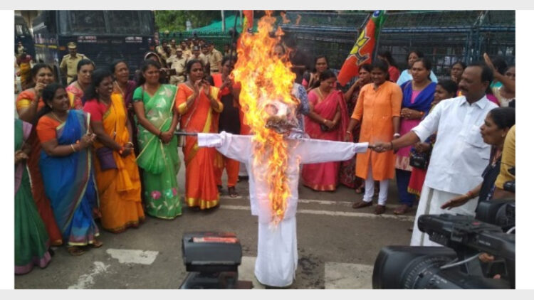 തിരുവനന്തപുരം: ശബരിമലയില്‍ അയ്യപ്പഭക്തരെ പോലീസ് തല്ലിച്ചതച്ച് അറസ്റ്റ് ചെയ്തതില്‍ പ്രതിഷേധിച്ച് മഹിളാമോര്‍ച്ച ജില്ലാ കമ്മറ്റിയുടെ നേത്യത്വത്തില്‍ സെക്രട്ടേറിയറ്റിലേക്ക് മാര്‍ച്ച് നടത്തി മുഖ്യമന്ത്രി പിണറായി വിജയന്റെ കോലം കത്തിച്ചു. മാര്‍ച്ച് മഹിളാമോര്‍ച്ച സംസ്ഥാന അധ്യക്ഷ വി.ടി. രമ ഉദ്ഘാടനം ചെയ്തു.