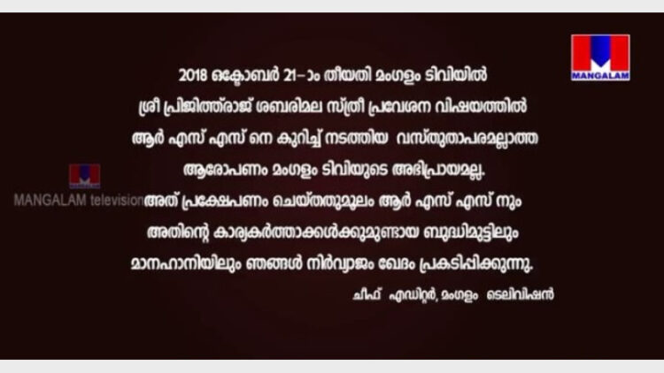 ശബരിമല വിഷയവുമായി ബന്ധപ്പെട്ട് മംഗളം ടിവിയില് ഒക്ടോബര് 21-ാം തീയതി നടന്ന ചര്ച്ചയില് പ്രജിത്ത്രാജ് എന്ന വ്യക്തിയാണ് ആര്എസ്എസിനെതിരെ അപകീര്ത്തിപരമായ പ്രസ്താവനകള് നടത്തിയത്. ഇതിനെതിരെ ആര്എസ്എസ് നിയനപടി സ്വീകരിച്ചിരുന്നു. തുടര്ന്നാണ് സംഭവത്തില് ഖേദം പ്രകടിപ്പിച്ച് മംഗളം ചീഫ് എഡിറ്റര് ചാനലില് അറിയിപ്പ് കൊടുത്തത്. പ്രജിത്ത്രാജിന്റെ ആരോപണം മംഗളം ടിവിയുടെ അഭിപ്രായമല്ലെന്നും അത് പ്രക്ഷേപണം ചെയ്തതുമൂലം ആര്എസ്എസിനും അതിന്റെ കാര്യകര്ത്താക്കള്ക്കുമുണ്ടായ ബുദ്ധിമുട്ടിലും മാനഹാനിയിലും ഖേദം പ്രകടിപ്പിക്കുന്നു എന്നായിരുന്നു അറിയിപ്പ്.