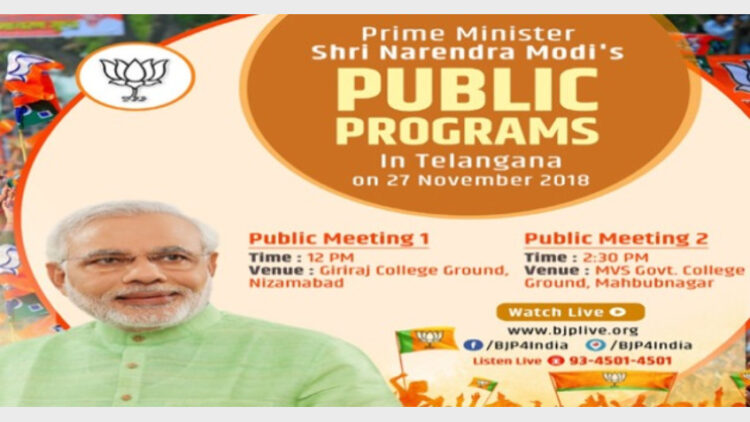 തെലങ്കാന നിയമസഭാ തെരഞ്ഞെടുപ്പ് ഡിസംബര് ഏഴിന് നടക്കാനിരിക്കേ കഴിഞ്ഞാഴ്ച ബിജെപി ദേശീയ അധ്യക്ഷന് അമിത്ഷായും ഞായറാഴ്ച പ്രചാരണത്തിന് എത്തിയിരുന്നു. കൂടാതെ ബുധനാഴ്ചയും അടുത്തമാസം രണ്ടിനും അമിത്ഷാ പ്രചാരണത്തിനായി എത്തും.