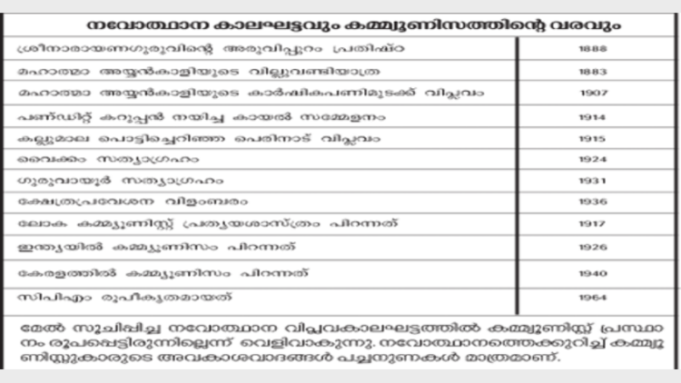 നവോത്ഥാന നായകരെ അവഗണിച്ചും അവഹേളിച്ചും നവോത്ഥാന മൂല്യങ്ങള് കുഴിച്ചുമൂടി നവവിപ്ലവ പ്രത്യയശാസ്ത്രത്തിന്റെ വാഗ്ദാനങ്ങളായിരുന്നു തൊഴിലാളി വര്ഗ്ഗസര്വ്വാധിപത്യവും സോഷ്യലിസവും. ”നമ്മള് കൊയ്യും വയലെല്ലാം നമ്മുടെതാകും പൈങ്കിളിയേ” എന്നിവ രാഷ്ട്രീയ ഭാണ്ഡങ്ങളില് നിറച്ച് തലയിലേറ്റി ആറുപതിറ്റാണ്ട് സഞ്ചരിച്ച് കേരളത്തില് എത്തി, ഭാണ്ഡങ്ങള് തുറന്നപ്പോള് രക്തസാക്ഷികളുടെ അസ്ഥിപഞ്ജരങ്ങളും, കരിഞ്ഞ മാംസഗന്ധവും, മതജാതി സംഘര്ഷങ്ങളുടെയും, രാഷ്ട്രീയ സംഘട്ടനങ്ങളുടെയും അട്ടഹാസങ്ങളും ആള്ക്കൂട്ട കൊലപാതകങ്ങളും വിവേചനങ്ങളും പ്രീണനങ്ങളും അഴിമതികളും അധികാര രാഷ്ട്രീയത്തിനുവേണ്ടിയുള്ള വരട്ടുതത്വവാദങ്ങളും കപടമതേതര പൊയ്മുഖങ്ങളും നിറഞ്ഞ ദുര്ഗന്ധം വഹിക്കുന്ന രാഷട്രീയ മാലിന്യങ്ങളാണ് നാം കാണുന്നത്. അത് വഴിയിലുപേക്ഷിച്ച് പിന്നീട്ട വഴികളിലൂടെ പുറകോട്ട് സഞ്ചരിച്ച് കുഴിച്ചിട്ട നവോത്ഥാന മൂല്യങ്ങള് തോണ്ടിയെടുത്ത് ഗ്രാമങ്ങളുടെ തെരുവുവീഥികളില് പോലും വ്യാജമരുന്ന് കച്ചവടക്കാരന്റെ വാചാലതയോടെ വില്ക്കേണ്ട ഗതികേടിലെത്തിയത് ചരിത്രനിയോഗമാണ്.