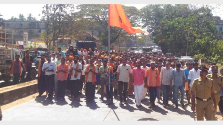 ആര്‍എസ്എസ് കാസര്‍കോട് താലൂക്ക സംഘചാലക് ദിനേശ് മടച്ചിറ, ബിജെപി സംസ്ഥാന സമിതി അംഗം രവീശ തന്ത്രി കുണ്ടാര്‍, ശബരിമല കര്‍മ്മസമിതി ജില്ലാ വൈസ് പ്രസിഡന്റ് എന്‍ മുരളീധരന്‍, രക്ഷാധികാരി മോനപ്പ ഗുരുസ്വാമി, യുവമോര്‍ച്ച സംസ്ഥാന വൈസ് പ്രസിഡന്റ് ബിജു എളക്കുഴി, ബിജെപി ജില്ലാ ജനറല്‍ സെക്രട്ടറി പി രമേശ്, മണ്ഡലം പ്രസിഡന്റ് സുധാമ ഗോസാഠ, കൗണ്‍സിലര്‍മാരായ കെ.ജി. മനോഹരന്‍, ശങ്കര, ശ്രീലത ടീച്ചര്‍ തുടങ്ങിയര്‍ പ്രകടനത്തിന് നേതൃത്വം നല്‍കി. ആചാരലംഘനത്തിനെതിരെ വിവിധ ജില്ലകളില്‍ ഇത്തരത്തില്‍ വന്‍ പ്രതിഷേധമാണ് ഭക്തരുടെ ഭാഗത്ത് നിന്നുണ്ടാകുന്നത്.