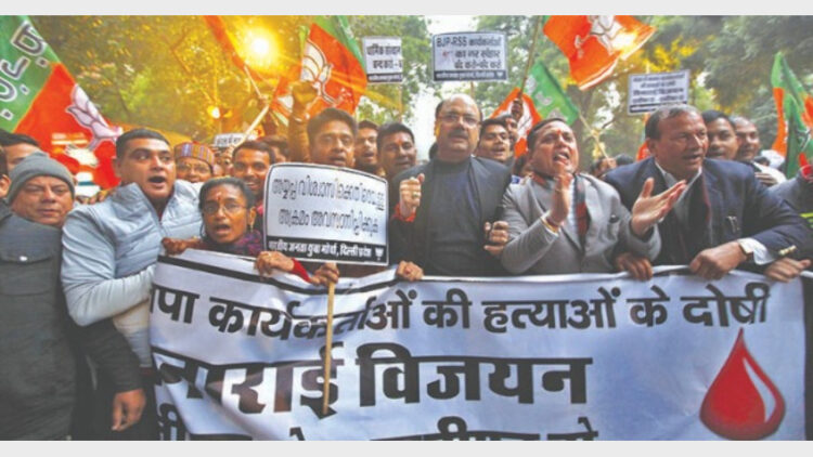 സ്ത്രീകളടക്കം നൂറ് കണക്കിനാളുകള്‍ പ്രതിഷേധത്തില്‍ അണിനിരന്നു. കേരളത്തിലെ ഭരണകൂടത്തിന്റെ ഹിന്ദുവേട്ട അവസാനിപ്പിക്കുക, സിപിഎം കൊലക്കത്തി താഴെയിടുക തുടങ്ങിയ മുദ്രാവാക്യങ്ങള്‍ ഉയര്‍ത്തിയായിരുന്നു മാര്‍ച്ച്. സിപിഎം അക്രമം തുടര്‍ന്നാല്‍ ദല്‍ഹിയിലടക്കം തിരിച്ചടി നേരിടേണ്ടി വരുമെന്ന് യുവമോര്‍ച്ച അധ്യക്ഷന്‍ സുനില്‍ യാദവ് പറഞ്ഞു. ജനറല്‍ സെക്രട്ടറിമാരായ കുല്‍ദീപ് ചെഹല്‍, രാജീവ് ഭാട്ടിയ തുടങ്ങിയവര്‍ നേതൃത്വം നല്‍കി. ഏതാനും ദിവസം മുന്‍പ് അയ്യപ്പ വിശ്വാസികളും കേരളാ ഹൗസിലേക്ക് മാര്‍ച്ച് നടത്തിയിരുന്നു.