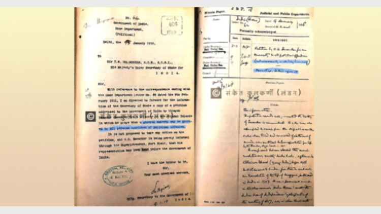 വീര സവര്‍ക്കര്‍ മാപ്പ് എഴുതിക്കൊടുത്താണോ ജയില്‍ മോചിതനായത്? അതിനുള്ള ശ്രമങ്ങള്‍ അദ്ദേഹം നടത്തിയോ…?. എന്താണ് അദ്ദേഹം പോര്‍ട്ട് ബ്‌ളയറിലെ സെല്ലുലാര്‍ ജയിലില്‍ നിന്ന് ബ്രിട്ടീഷുകാര്‍ക്ക് എഴുതിക്കൊടുത്തത്?  ആ രേഖകള്‍ പലതും ലണ്ടനില്‍ ബ്രിട്ടീഷ് ആര്‍ക്കൈവ്‌സില്‍ ഉണ്ട്. അതില്‍ ചിലത് ഇപ്പോള്‍ പുറത്തുവന്നിട്ടുണ്ട്. ട്വിറ്ററിലെ സുഹൃത്തായ  സങ്കേത് കുല്‍ക്കര്‍ണി നടത്തിയ പരിശ്രമങ്ങളാണ് അതിന് വഴി തുറന്നത്. രണ്ടെണ്ണം അദ്ദേഹത്തിന് ലഭിച്ചിരിക്കുന്നു. അതില്‍ ഒന്ന് ഇവിടെ ചേര്‍ക്കുന്നു. സവര്‍ക്കര്‍ നല്‍കിയ അപേക്ഷയെക്കുറിച്ചും ബ്രിട്ടീഷ് ജയില്‍ അധികൃതര്‍ നല്‍കുന്ന വിശദീകരണങ്ങളെക്കുറിച്ചും അതിലുണ്ട്. കേന്ദ്ര സര്‍ക്കാര്‍ ഇക്കാര്യത്തില്‍ കൂടുതല്‍ ശ്രദ്ധചെലുത്തേണ്ടതുണ്ട്. ബ്രിട്ടന്റെ കയ്യിലുള്ള രേഖകള്‍ ഇന്ത്യയില്‍ ലഭ്യമാക്കണം.