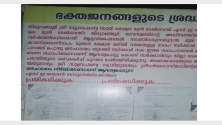 തിരുവഞ്ചൂര്‍ ക്ഷേത്രത്തിന്റെ  സ്ഥലം പിടിച്ചെടുത്ത് അവിടെ പൊതു ശൗചാലയം നിര്‍മ്മിക്കണമെന്ന് ആവശ്യപ്പെട്ട് ഇയാള്‍ റവന്യു മന്ത്രിക്ക് പരാതി നല്‍കിയിരുന്നു. ക്ഷേത്രത്തിന് സമീപം താമസിക്കുന്ന ചിലരുടെ ഒപ്പിട്ടാണ് പരാതി നല്‍കിയത്.  പരാതിയുടെ കോപ്പി വിവരാവകാശ നിയമപ്രകാരം ദേവസ്വം ബോര്‍ഡിന് ലഭിക്കുകയും ബോര്‍ഡ് ഇത് പുറത്ത് വിടുകയും ചെയ്തു.