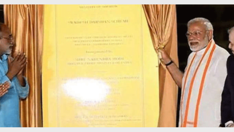 സ്വദേശി ദര്ശന് പദ്ധതിയുടെ ശിലാഫലകം അദ്ദേഹം അനാവരണം ചെയ്തു. തുടര്ന്ന് തന്ത്രി മഠത്തിലെത്തിയ പ്രധാനമന്ത്രി കേരളീയ വേഷമണിഞ്ഞ് ക്ഷേത്ര പടവുകള് കയറി. ഗവര്ണര് ജസ്റ്റിസ് പി. സദാശിവം, മന്ത്രി കടകംപള്ളി സുരേന്ദ്രന്, വി.മുരളീധരന്, സുരേഷ് ഗോപി, അഡ്വ.പി.എസ് ശ്രീധരന് പിള്ള തുടങ്ങിയവര് അദ്ദേഹത്തോടൊപ്പം അനുഗമിച്ചു. തിരുവിതാംകൂര് രാജകുടുംബാംഗങ്ങളും ക്ഷേത്ര ഭാരവാഹികളും ചേര്ന്ന് ക്ഷേത്രത്തിലേക്ക് പ്രധാനമന്ത്രിയെ സ്വീകരിച്ചു.