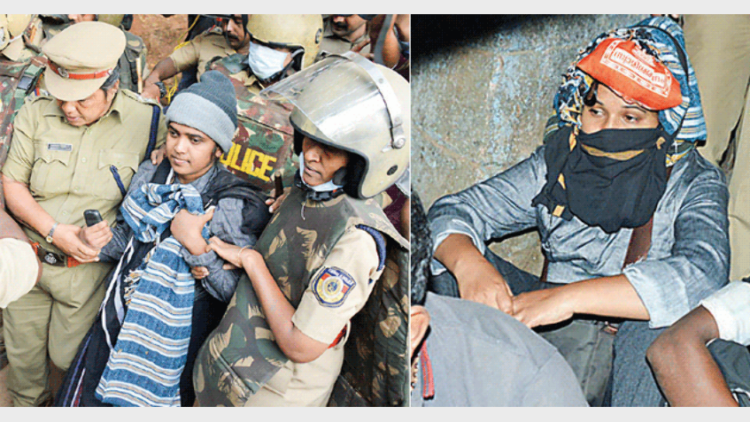 പുലര്‍ച്ചെ നാലേകാലോടെ പുരുഷവേഷത്തില്‍ മലകയറ്റം ആരംഭിച്ച യുവതികളെ നീലിമലയില്‍ വച്ച് ആന്ധ്രയില്‍ നിന്നുള്ള ഭക്തര്‍ തിരിച്ചറിഞ്ഞു. ശരണം വിളികളുമായി ഇവര്‍ യുവതികളെ തടഞ്ഞു. പമ്പയില്‍ നിന്ന് പോലീസ് എത്തി ഇവരെ നീക്കം ചെയ്തു. ഏഴുപേരെ കസ്റ്റഡിയിലെടുത്തു. യുവതികളുമായി മുന്നോട്ടു പോയി. എന്നാല്‍ നീലിമലയില്‍ മൂന്നാമത്തെ ഷെഡ്ഡിനു സമീപം വാട്ടര്‍ ടാങ്കിന് മുന്നില്‍ കൂടുതല്‍ തമിഴ്‌നാട്, ആന്ധ്രാ സ്വദേശികളായ ഭക്തര്‍ യുവതികളെ തടഞ്ഞ് വഴിയില്‍ ഇരുന്നു. ഇതോടെ മഫ്തിയിലുള്ള പോലീസുകാര്‍ സ്ഥലം വിട്ടു.
