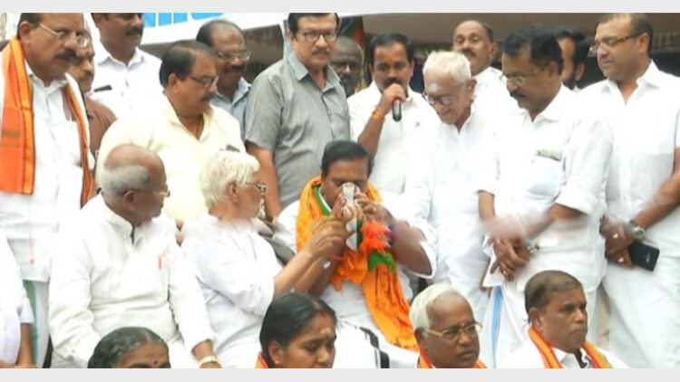 തിരുവനന്തപുരം: ശബരിമലയിലെ പ്രശ്നങ്ങളുമായി ബന്ധപ്പെട്ട് സെക്രട്ടറിയേറ്റിന് മുന്നില് ബിജെപി നടത്തി വന്ന ഉപവാസ സമരം അവസാനിപ്പിച്ചു. 48 ദിവസം നീണ്ടുനിന്ന സമരം ഗാന്ധിയന് പി. ഗോപിനാഥന് നായര്, പൗരപ്രമുഖര് അയ്യപ്പന്പിള്ള എന്നിവര് ചേര്ന്ന് സമര നായകന് പി.കെ. കൃഷ്ണദാസിന് നാരങ്ങനീര് നല്കിയാണ് അവസാനിപ്പിച്ചത്.