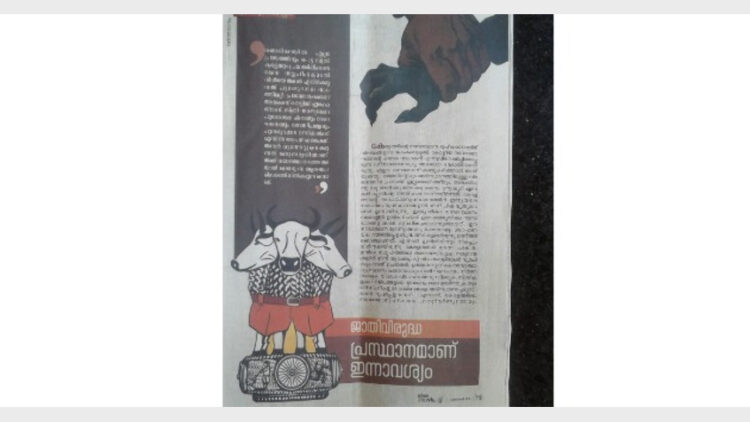 അശോക സ്തംഭത്തിലെ സിംഹങ്ങളുടെ തലയ്‌ക്ക് പകരം പശുവിന്റെ തല ചേര്‍ത്തും താഴേക്കുള്ള ഭാഗത്ത് നിക്കര്‍ ധരിപ്പിച്ചുമാണ് വികൃതമാക്കിയിരിക്കുന്നത്. ജാതിവിരുദ്ധ പ്രസ്ഥാനമാണ് ഇന്നത്തെ ആവശ്യമെന്ന തലക്കെട്ടിലെഴുതിയിരിക്കുന്ന ലേഖനത്തിലാണ് ചിത്രം.