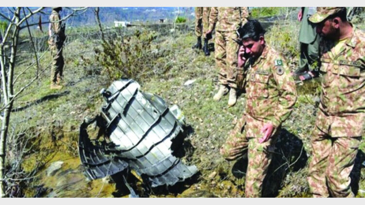 ഇന്ത്യ വെടിവെച്ചിട്ട പാക്കിസ്ഥാന്റെ എഫ് 16 യുദ്ധവിമാനത്തിന്റെ അവശിഷ്ടങ്ങള്‍ പാക് അധിനിവേശ കശ്മീരില്‍ പാക് സൈനിക ഉദ്യോഗസ്ഥര്‍ പരിശോധിക്കുന്നു