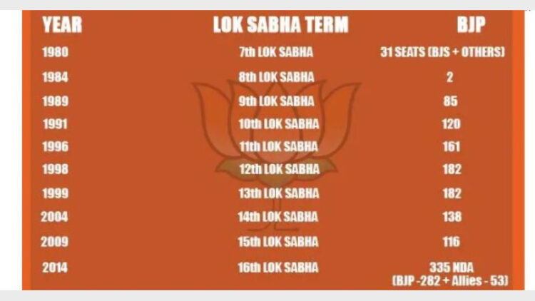അഞ്ചു വര്ഷം കഴിഞ്ഞ് നടന്ന തെരഞ്ഞെടുപ്പില് രണ്ടില് നിന്ന് 85 സീറ്റിലേക്കായിരുന്നു ബിജെപിയുടെ കുതിപ്പ്. 1991ല് സീറ്റ് 10 ആയി. 1996 (161), 1998 (182), 1999(182), 2004(138) 2006(116) എന്നിങ്ങനെയായിരുന്നു ബിജെപി സീറ്റ്. 2014 ല് 282 സീറ്റ് സ്വന്തമാക്കി ചരിത്രവിജയവും ബിജെപി സ്വന്തമാക്കി.
