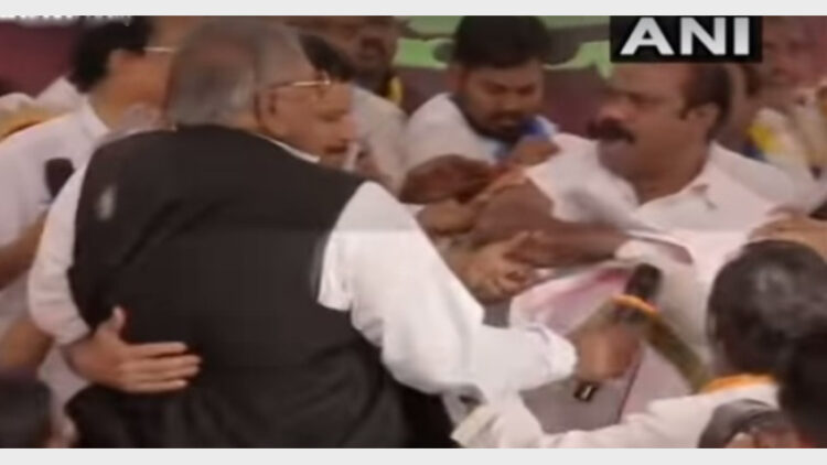 സംസ്ഥാനത്തെ മുതിര്‍ന്ന കോണ്‍ഗ്രസ് നേതാവായ ഹനുമന്ദ റാവുവും ഒരു പ്രാദേശിക നേതാവുമാണ് സമരവേദിയിലെ ഇരിപ്പിടവുമായി ബന്ധപ്പെട്ട തര്‍ക്കത്തില്‍ അടിപിടികൂടിയത്.
