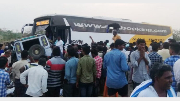 ബെംഗളൂരുവിലേക്ക് പോയ സ്വകാര്യ ബസാണ് അപകടത്തില്പെട്ടത്. ഒരു ഇരുചക്രവാഹനത്തെ മറികടക്കാന് ശ്രമിക്കുന്നതിനിടെ ബസിന്റെ നിയന്ത്രണം നഷ്ടമാവുകയായിരുന്നു. പിന്നീട് മീഡിയനിലേക്ക് ഇടിച്ച് കയറിയ ബസ് റോഡിന്റെ മറുവശത്ത് എതിര്ദിശയില് നിന്ന് വരികയായിരുന്ന ടെംപോ ട്രാവലറിലും ഇടിച്ചു.