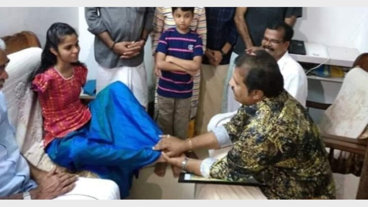 മലപ്പുറം: ഇരുകൈകളുമില്ലാതെ കാലുകള് ഉപയോഗിച്ച് പത്താംക്ലാസ് പരീക്ഷ എഴുതി മികച്ച വിജയം നേടിയ ദേവിക എന്ന മിടുക്കിയെ നേരില് കാണാന് സുരേഷ് ഗോപിയെത്തി. വള്ളിക്കുന്നത്തെ വീട്ടിലെത്തിയായിരുന്നു സന്ദര്ശനം. ദേവികയുടെ കാലില്തൊട്ട് അഭിനന്ദിക്കുന്ന ചിത്രം സുരേഷ് ഗോപി തന്നെ തന്റെ ഫേസ്ബുക്ക് പേജിലൂടെ ഷെയര് ചെയ്യുകയും ചെയ്തു.