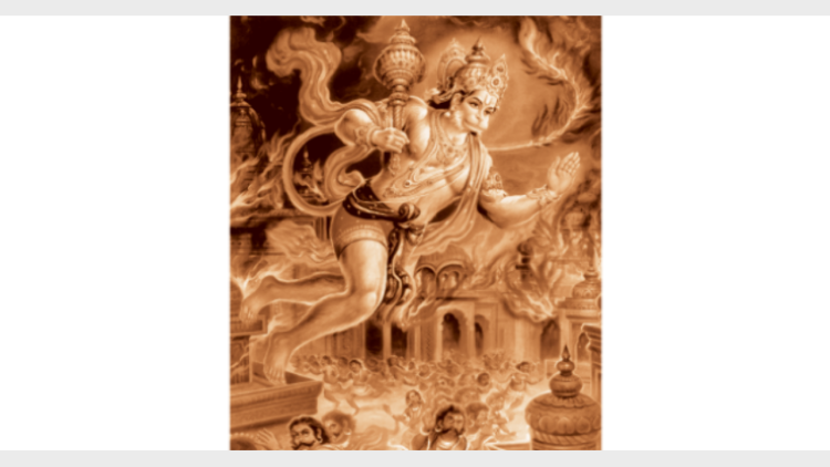 ശരീരത്തില് കെട്ടിയ കയറുകള് നൂലുപൊട്ടുന്നതുപോലെ പൊട്ടിയഴിഞ്ഞു. ഹനുമാന് നിവര്ന്നു നിന്നു. വാലിന്റെയറ്റത്ത് ജ്വലിക്കുന്ന തീയുമായി വിചിത്രമതിയായ മാരുതി വാലൊന്നു വളച്ച് രാവണന്റെ മീശകളിലേക്ക് കാണിച്ചു. മീശ ആളിക്കത്തി.