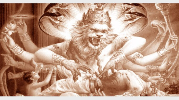 ‘ അങ്ങയിലും എന്നിലുമെല്ലാമുള്ളത് നാരായണ മൂര്ത്തിയാണ്. സര്വ്യവ്യാപിയും എല്ലാവരാലും ആരാധ്യനുമായ നാരാണയണന് തൂണിലും തുമ്പിലുമെല്ലാമുണ്ട്.’ പ്രഹ്ലാദന് പറഞ്ഞതു കേട്ട് ” ഈ തൂണിലുമുണ്ടോ നിന്റെ നാരായണന് ?’ എന്നു പരിഹാസത്തോടെ ചോദിച്ച ഹിരണ്യകശിപു അടുത്തുള്ള തൂണില് ആഞ്ഞു ചവിട്ടി. അത് അനങ്ങിയില്ല. പിന്നീട് അതില് വെട്ടി. ഉടന് കരിങ്കല് തൂണ് പിളര്ന്നു വീണു. ഭീമാകാരമായൊരു രൂപം പ്രത്യക്ഷപ്പെട്ടു. നരസിംഹം!